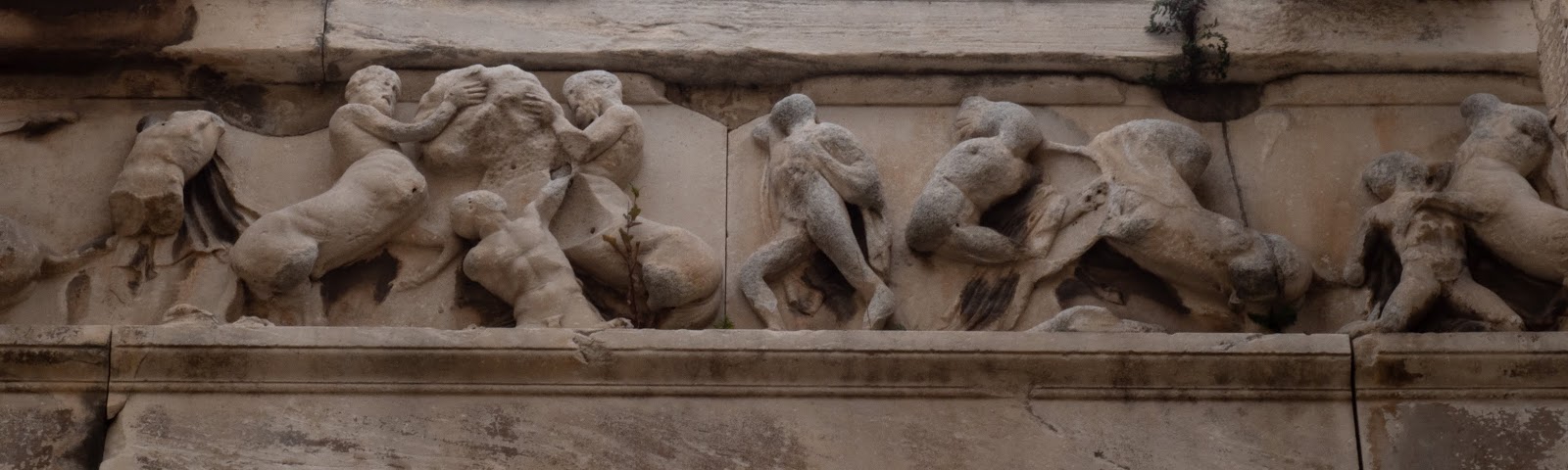 This was our last stop of the day. The Acropolis was less strenuous that expected. The Roman Agora was really small. The Ancient Agora had a lot of stuff spread over more area. Our first glimpse was from a busy restaurant street. The first scene houses the museum - with graffiti on it. A train track runs directly in front of it - and the trains are brightly painted with lettering on it.
