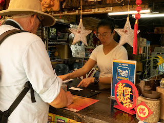 Originally we were just going to get drinks here - but they had fish on the lunch menu and most places only serve fish for dinner. I had a hard time choosing the flavoring. But in the end it didn't matter as they poach the fish alone and add the sauce later. So the fish is not really flavored - and it was so good! Michael got battered and fried soft-shell crabs. We also ordered fried rice and kailan which is a green that was sautéed and flavored with soy sauce. We all shared - including our driver - and it was all good. But so far the most expensive meal in Penang. About $40 USD.